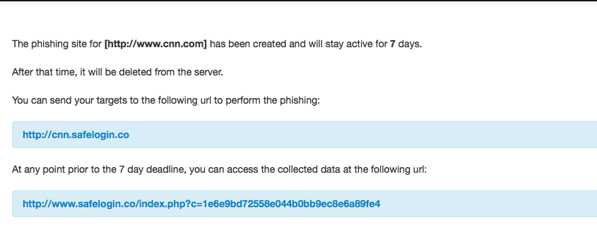 After you enter your data safelogin.co will provide you with two links. The first is for the phishing site and the second is where you can pickup your harvested credentials.